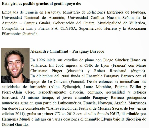 Después de haber sido acogida con tremendo éxito en Europa y África en mayo de este año, esta gira llega a Paraguay, en donde reunirá a tres grandes agrupaciones: el Ensamble Paraguay Barroco, el Ensamble Trondheim Barokk (Noruega) y el Coro Polifónico Municipal de la ciudad de Villarrica bajo la dirección del clavecinista franco- paraguayo Alexandre Chauffaud y el cellista noruego Martin Wåhlberg.
